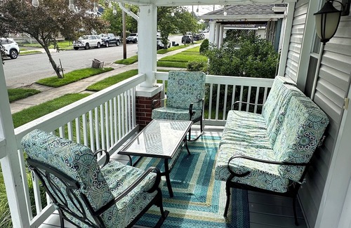 Our cozy, craftsman style cottage is the perfect getaway by the shore! Located on a quiet street in the heart of Belmar, 5 walkable blocks from the beach and 2 blocks from Main Street. 2 Bedrooms (1 with Queen bed, 1 with 2 twins), 1 1/2 baths, with washer and dryer. Two very large seating areas, each with pull-out couches. Hardwood floors throughout. Kitchen equipped with all necessities! All linens provided. Inviting front porch to enjoy a cup of coffee or glass of wine! Gas grill provided, although you'll want to sample some of the many restaurants Belmar has to offer!