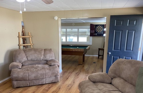 This home provides a large covered car port, spacious front and back patios, a wood burning fire pit in the back yard, ping pong and pool table. 3 bedrooms and 2 bathrooms comfortably sleeping 8 people. Home is outfitted with WiFi, living and primary have tvs. Full size Washer/dryer, coffee pot, kitchen items, games, movies, comfortable linens and towels.