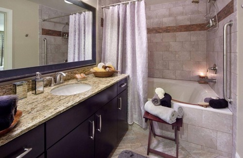 The 1 Bedroom Deluxe Villa offers extra space and comfort, featuring a king bed in the master bedroom and a queen sleeper sofa in the living area—perfect for small families or a couple’s getaway. A fully equipped kitchen, in-suite washer and dryer, cozy fireplace, and private balcony or patio make it easy to unwind after a day of sightseeing and entertainment.