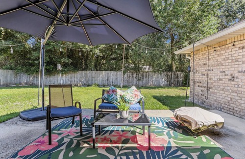 Spacious 4BR/3BA pet-friendly home with room for 8! Enjoy 2 king beds, 1 queen & 2 fulls, a renovated kitchen with breakfast nook + dining room, open-concept living with smart TV, a bar area, and a large fenced patio. Just minutes from downtown, UWF & Pensacola Beach. Perfect for families, groups & friends! Parking is easy with a spacious driveway for multiple vehicles. This home is ideal for a family-friendly getaway.