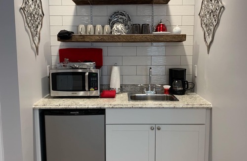 The studio has a kitchenette with a microwave and a mini fridge, so don’t expect to cook in this unit other than heating meals. You have a private separate entrance and the studio has a 3/4 bath with a walk in shower that is also private.