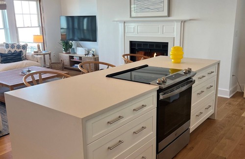 Enjoy a morning coffee on covered patio overlooking Jamestown's harbor and waterfront. Adjacent to restaurants, bars and shops on Narragansett Avenue. Bike and hike to the island's parks, beaches and historic sites. Golf is less than one mile away. Recently renovated Two bdrm, two bath condo. New kitchen, two flat screens, wifi, kitchen appliances, beds and furnishings. Walk to the water taxi and board for 15-20 minute boat ride to Newport's waterfront restaurants, bars and shops. Bike to Beavertail Lighthouse and Fort Weterill. Comes equipped with 2 bikes, beach chairs and beach towels. July, August,& September rental with flexible start date.