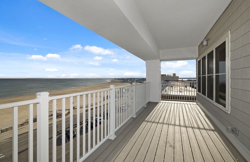 Breathtaking views in this spacious penthouse condominium located in the top floor of the recently built “Oceanhouse” property directly across from the sand and the surf! Enjoy sipping your morning coffee on the large deck watching the waves roll in and out, and get lost in sweeping views of the ocean from the large living space. Great kitchen with island seating area, big dining table, and very large living room with plenty of seating and cable TV. Unobstructed views of the ocean from the large covered deck and living space. Primary bedroom suite with king bed, walk-in closet and private bath with tile shower. Secondary bedroom has full-size bunk bed and additional full bath with tub/shower. Full size sleeper sofa in the living room. Location offers easy walking access to everything on Hampton Beach- shopping, entertainment, restaurants, and the pristine beach! TWO reserved parking spaces behind the building in a gated parking lot. Linens and towels provided. Kitchen stocked with all cooking and serving necessities. Beach chairs, umbrella and towels provided.