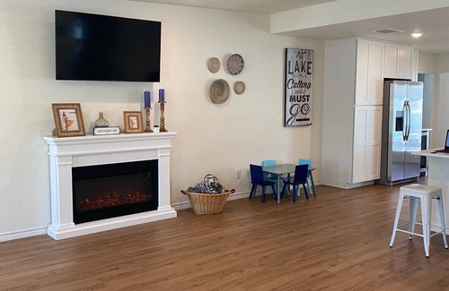 Newly renovated 5/3 home just off the main body of water on Lake LBJ. Large covered back patio with mounted fans and lighting. We love watching the birds and hummingbirds while sitting on the back porch. Deer often gather across the street from the front porch. Large spacious kitchen and living area with an electric fireplace and 55" TV. Kitchen is fully equipped and has new appliances, including a separate drink fridge. The master bedroom has a king size bed, mounted tv, window facing the water, and private bathroom. The second bedroom has a queen size bed, mounted tv, window facing the water, and private bathroom. One other bedroom has bunk beds with full size mattresses (one person over age six only on top bunks). The fourth bedroom has a queen size bed. There is also a kids tv room with a daybed, games and books. Smart TVs are located in two bedrooms and the living room so you can log on to your favorite streaming services. There is a fire stick on the TV in the kids room where you can log on there as well. There is a pack & play, crib sheet, and portable highchair stored in the master bedroom closet. Established yard with sprinkler system.