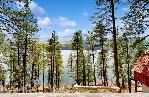 This log cabin sits among the evergreens on a hill just above the lake, with a spacious deck overlooking the water and the surrounding snow-capped peaks. The interior is incredibly atmospheric, with wood paneling adorning the walls and a living space that brings together the living room, the kitchen, and the dining room. Before a day of adventure, you can flip pancakes on the stove in the kitchen, sip your morning coffee at the two-person breakfast bar, and sit down to eat with your loved ones at the dining table for four or outside on the deck.