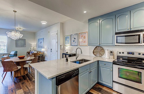 Step inside this bright and open condo and immediately feel at ease. Designed for comfort, the living room features a plush couch, cozy chair, smart TV, and direct balcony access. Slide open the doors and step out to your private balcony with seating for two, where you’ll be treated to breathtaking views of the bay—the perfect spot for morning coffee or sunset cocktails. The kitchen is both stylish and functional, with light blue cabinetry adding a coastal touch, stainless steel appliances, counter seating for four, and a single-cup Keurig for your caffeine fix. A dining table for four makes it easy to enjoy meals in, whether you order in takeout from a local spot or are digging into some home-cooking.