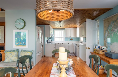 “The Orr’s Island Cottage” is much more than a cottage. It is an enchanted and charming home boasting expansive views of Harpswell Sound. This is a well maintained, year-round home located on the shore of Harpswell Sound. Orr's Island, Maine is a peninsula connected by bridges to Harpswell and Brunswick- just 15 minutes from Brunswick, home of Bowdoin College and a great downtown area. The interior and exterior blend one into the other through sliding glass doors across the width of the home-opening onto multi-decking and stairs to the private waterfront, complete with floating walkways and dock- ideal for fishing, boating, kayaking and sunbathing. This open concept floor plan provides a natural flow from the fully equipped kitchen, dining area, and living room. The large fireplace, hardwood floors, wood ceilings, create a warm, charming, romantic, perfect vacation retreat. This cottage feels vintage with all the modern amenities, i.e. tv in each room, high speed wi-fi access and air conditioning. We also have books and DVDs for those that want to relax. Don't miss the breathtaking sunsets from the comfort of the house or the outside decks! Professionally designed and accessorized for your comfort. High quality linens are provided by owner.