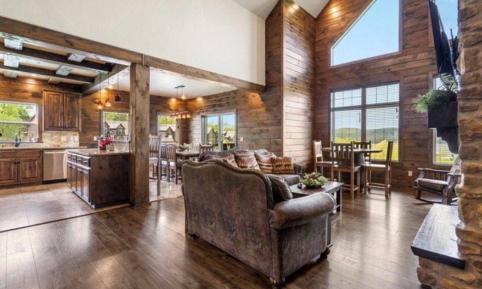 The main level living area has charming tongue-and-groove wood ceilings and walls and a majestic 28-foot floor-to-ceiling river rock stone fireplace (electric), complete with a wall of windows to better enjoy the view of beautiful Table Rock Lake!