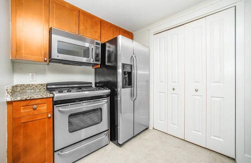 The kitchen has stainless steel appliances and granite countertops. It has all the utensils and gadgets including a blender, coffee maker, Keurig, and toaster.