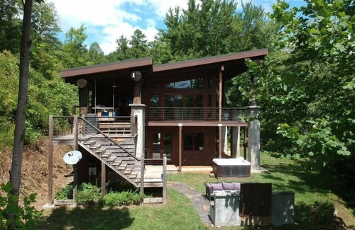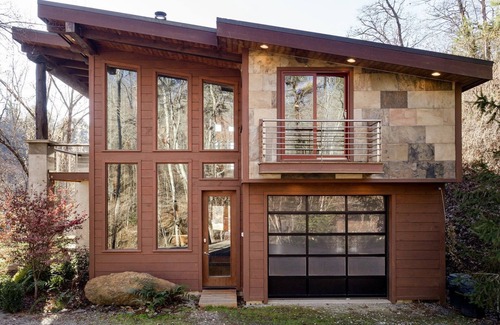 The custom modern design by the owner of Watershed himself and the construction with repurposement and other environmentally-friendly methods as a focus make this home special. This 'mountain-modern' cabin with its chic industrial loft elements styled with a mountain flair sits perfectly on a private lot with a long-range, sunset view of Sassafras Gap. The design details need to be witnessed, but the features like home theater, indoor and outdoor rain showers, master jetted tub, and of course floor to ceiling windows, make this one of our premiere cabins, if you dare use that term for it. And for 2020, we have added a wet/dry sauna as an amenity! Also, it is located on our 50-acre tract we call the Watershed Resort.