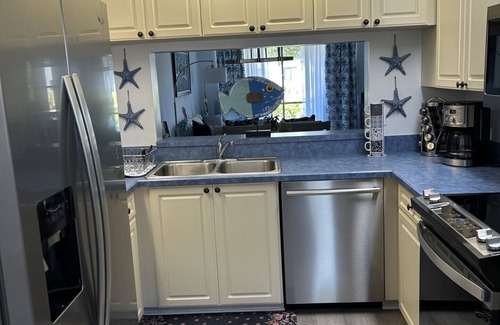 Stylish and spacious condo unit on the ground floor. Large screened veranda with a wonderful water view. Amazing water view from the master bedroom as well. Split bedroom style to accommodate guests easily. King beds in both bedrooms and two XL twin coaches in the living room. 60" smart Roku TV in the living room. Completely renovated - new flooring, new kitchen appliances, new furniture and new bathroom fixtures,
