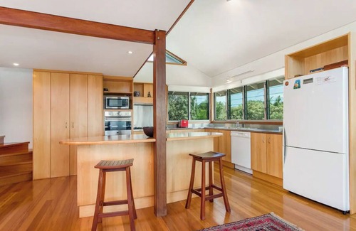 Upstairs is the large deck, open plan kitchen, dining and living space- all with incredible northerly vistas. Kick back with a book on the sun lounge while you listen to the sound of birds and waves. Dine alfresco on the terrace or simply relax on the couch and watch the large flat screen smart TV.