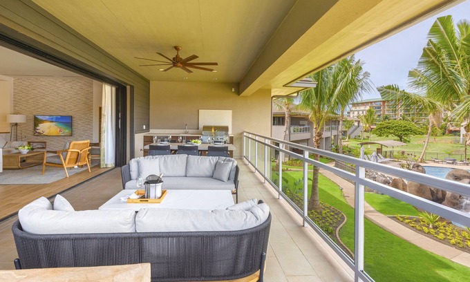 This Upper Level villa will provide you with the privacy to relax in your lanai while enjoying the views of your garden enclave. The residence is fully furnished with everything you need for a luxurious Maui vacation and a gourmet kitchen to prepare your favorite family meals. The Lanai is equipped with an outdoor kitchen and BBQ and plenty of lounging and dining space for the entire family. The residence also includes a private garage and an ensuite full size washer and dryer.