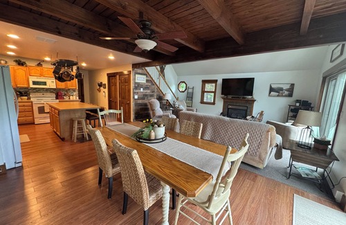 Enjoy stunning seasonal lake views from the expansive deck at "On the Rocks"! Inside, the open floor plan and soaring cathedral ceilings create a bright, spacious atmosphere perfect for family gatherings. Relax in the cozy screened porch—an ideal spot to unwind and enjoy the fresh mountain air.