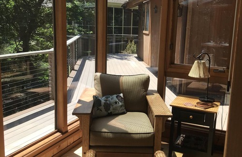 We love coming to the treehouse just off clear Rock Lake. The Treehouse is a getaway, although there are neighbors, you feel as if you are nestled in a grove of trees. The house itself provides places where guests can linger, relax, sip a glass of wine or a cup of java or simply just be. One of my favorite features is the glass windows that wrap up around the ceiling so that it feels like the outside is coming in. *NOTE* children are completely welcome-the property has stairs and a two story wrap around deck fyi.