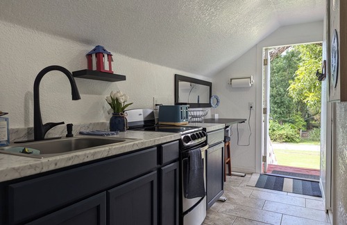 Ascend your very own private staircase to discover a delightful two-bedroom, one-bath suite. The moment you step through the door, you'll be greeted by a whimsical ambiance that exudes character and coziness. It's like staying in a treehouse, but with all the amenities you could dream of!