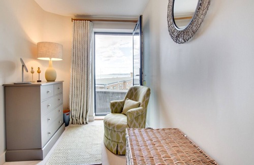 Size: Sleeps 4 in 2 bedrooms Beds: King size bed in master bedroom, super king 'zip and link' bed in second bedroom, which can be set as two twin beds on request (please confirm bed make up at the time of booking) Rooms: Open plan and sociable - modern kitchen with breakfast bar, living area, dining area. King size master bedroom with Juliette balcony and en-suite shower room. Spacious hallway with utility cupboard. Second bedroom super king size bed with option to have as two twin beds on request . Family bathroom with bath, wash hand basin and W.C. Kitchen/Utilities: Gas hob, electric oven, kettle, microwave, toaster, Magimix coffee machine, washer / dryer, integrated fridge and freezer Entertainment: Flat screen TV Parking: Parking available in underground allocated parking space Balcony: Balcony opening out from kitchen with outdoor seating. Juliette balcony in master bedroom General: WiFi included, towels and bedding included, please bring your own beach towels. Pets: Sorry no pets