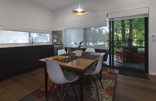 Bower 63 offers guests a modern hinterland escape only 2 minutes from the thriving township of Maleny and close to local attractions on the picturesque Blackall Range of Queensland's Sunshine Coast. The two bedroom detached house is sparklingly new, boasting modern appliances and amenities. The contemporary, quirky decor reflects the iconic 60's & 70's Mid-Century era, complete with geometric designs, teak cigar legged tables, and my personal favourite, a burnt orange replica Featherston chair. The name Bower 63 is due to a beloved resident of our 1 acre garden, a male Satin Bower Bird complete with his scattered hoard of blue treasures. The 63 reflects the Mid-Century period, and denotes my birth year. Bower 63 rests amidst a green garden setting beneath established deciduous trees and over looks fertile farming land, hills and the Obi Obi creek tree line with furnished patios off the living and bedroom 1 to relax & take in the peaceful view. The bedrooms have luxury king & queen sized beds complete with beautiful linen. The modern fully equiped kitchen, and dining, living areas are spacious and kept comfortable beneath raked ceilings and reverse cycle air-conditioning.