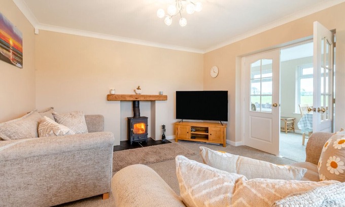 An inviting, Cumbrian hideaway, this homely, single-storey cottage is ideal for couples and small families. Sleeping five guests, it offers three bedrooms and a wrap-around garden where you can take in panoramic views across the surrounding countryside. Situated 4 miles from Allonby, which is known for its magnificent 5-mile beach, the property is perfect for anyone seeking to explore the dramatic Solway Coast and the Cumbrian countryside. The picturesque Lake District, which begins 6 miles from the holiday home, offers a myriad of enticing beauty spots, footpaths and family attractions. Visit Cockermouth, 9 miles away, to shop, dine out and see the birthplace of poet William Wordsworth. Venture 19.5 miles to Keswick to stroll along the shores of Derwentwater, where you can take a cruise on the lake or hire your own boat to explore at your leisure. Tranquil Bassenthwaite Lake, with its plethora of wildlife, is just 13 miles from your base. Step into this welcoming holiday home and discover the stunning views continue inside. Slide off your walking boots or wellies in the porch, hang your jackets and wander on into the hall. Make your way into the lovely, carpeted lounge, where you can sink back into the soft sofas to rest and recuperate after your latest adventure. Stoke up the wood burner in here on chilly evenings and flick through the apps on the Smart TV to find your favourite show. The lounge opens into a bright sunroom with a dining table. Sit in here to enjoy mealtimes together as you admire the impressive backdrop of the open countryside or recline in one of the comfortable seats and take in the views over a cup of tea. The stylish kitchen/diner, with its grey units and ample food storage and preparation space, encompasses all the equipment you will need to help you cater for your party. Pull a stool up to the breakfast bar in here for casual snacks. When you are ready to lay your head on your pillow, amble through to one of the two double bedrooms or the welcoming single. There is also an immaculate family bathroom that offers the choice of a bath or a shower. Savour the scenery from the sun-soaked wrap-around garden on fine days. Relax on the patio with a chilled glass of wine or dine under the stars. Find space for your bikes in the garage, which also houses a handy washing machine and dryer. There is parking for two cars at this property.