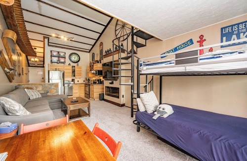 The entry level has a full kitchen, bathroom, and living area with a NEW 2019 renovated bathroom, kitchen, electric fireplace, large flat screen TV, sectional, and bunk beds. Up the unique spiral staircase are a loft-style bedroom with a king-size bed, flat-screen TV, and large picture window. Â Step out onto your private balcony or patio and take in the breathtaking lake views. When the weather is nice head down to the sandy beach for a day by the lake. No matter what the weather, there is plenty to keep you entertained with an on-site indoor pool, game room, fitness center, and more!