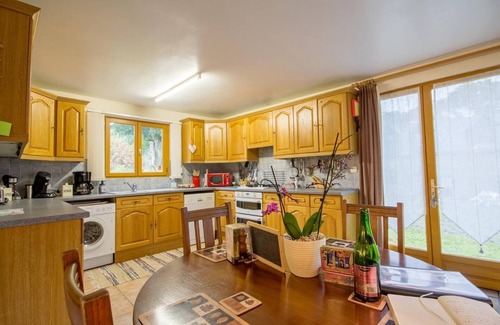 The cottage is self catering and is equipped with a very high standard. Ground floor is open plan in the traditional Breton style. Roof beams, trusses and original stone walls are exposed throughout. The kitchen is well equipped, microwave, washing machine, fridge, coffee maker. Heating is by burning wood stoves and electric wall heaters. All bedrooms are carpeted.