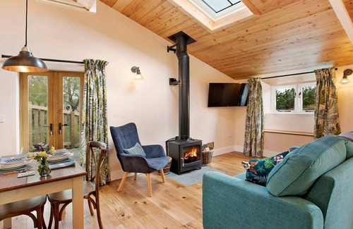 At the heart of the property is the open-plan kitchen/dining/lounge room which has wooden ceiling beams and velux windows. Snuggle up in front of the wood burner after a winter walk or on a chilly evening. There's a Smart TV with Freeview, plus access to Netflix /Amazon/iPlayer (own login details required), or you might be content just gazing at the views across the countryside.
