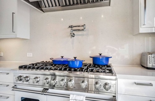 The kitchen includes an 8-burner Viking range, dual ovens, dishwasher and refrigerator. A Weber gas grill is on the deck outside the kitchen. There is a small eat-in-kitchen area, The dining room is cozy for small groups and easily expands to accommodate 8. The deck off the living/dining room is furnished and features views of Sonoma Valley.