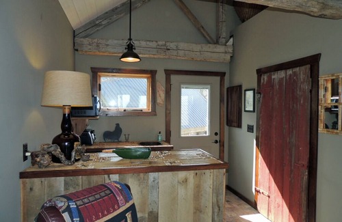 The Wine Haus room features interesting items collected over years of traveling in the wine country of France. Relax with a good book in one of the comfy chairs by a window or venture onto the deck to enjoy the valley view and the sounds of the forest around you. Unique features are a handmade bar countertop, hand-hewn barn beams and an antique walnut wardrobe.