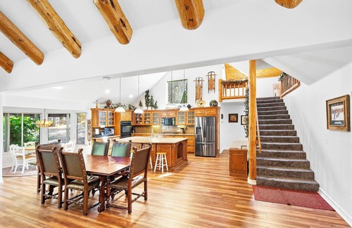 Living Room: Cathedral ceilings, log accents, river rock wood burning fireplace, wraparound sofa, large flat screen TV with cable, complimentary internet.