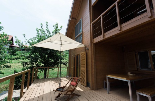The house is completely built with natural materials and offers unique combination of modern and classic furniture pieces, fireplace, fussball, big living area and terrace for sunbathing and leisure.