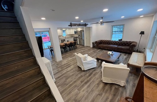 The basement is a studio apartment with stairs to the 1st floor. It has a large tub and shower in the bathroom, large washer and dryer, queen bed, and bunk beds. Includes an open living room connected to kitchen, a Large tv and sofas with large windows viewing the pond. A pack n play in the closet, and board games. Also a large patio, hot tub, stainless steel fire pit, ADK chairs, picnic table, and access to the pond just outside your door.