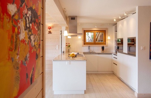 You will be staying in a 6-room chalet that is 230 square meters and spread across three levels, with a south-facing position. The chalet has been renovated and features comfortable and modern furnishings. The spacious living and dining area boasts a Scandinavian wood stove, and there is an exit leading to the terrace with a south-facing position. One bedroom is equipped with a French bed measuring 160 cm wide. The open kitchen is well-appointed with an oven, dishwasher, four induction hot plates, a toaster, kettle, electric coffee machine, and additional Nespresso capsules (for which you'll need to pay extra). The kitchen also includes a steamer, raclette grill, and a fondue set for cheese.