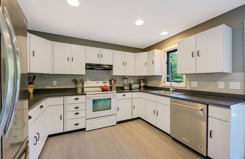 Fully equipped kitchen and dining table with extensions. Condiments/spices are available for guest use during their stay.