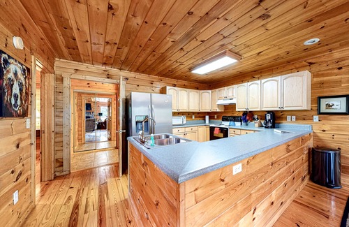 Nestled right on the banks of the river, this one-bedroom home is waiting to provide your next vacation with lots of happy memories! Inside, you'll find an expansive living space filled with lots of comfortable furniture, an all-wood interior, vaulted ceilings, and a wood-burning fireplace. You'll have two TVs to stream your favorite movies and shows on, so be sure to use the microwave to pop plenty of popcorn for the gang before snuggling up on the living room sofa for a night of entertainment. The full kitchen features all the small and major appliances the family chef will need and there's lots of counter space to work on when preparing delicious meals. Serve up to eight guests at the handsome wood dining table or take your plates out to the spacious deck to enjoy an al-fresco meal at the table/chair set or from the comfort of a good rocking chair. After dinner, let the dishwasher knock out all the cleanup while you head down to the firepit for an evening of toasted 'Smores and some terrific stargazing. The free WiFi will make it easy to research a fun outdoor adventure while the central AC and ceiling fans keep the home nice and cool.
