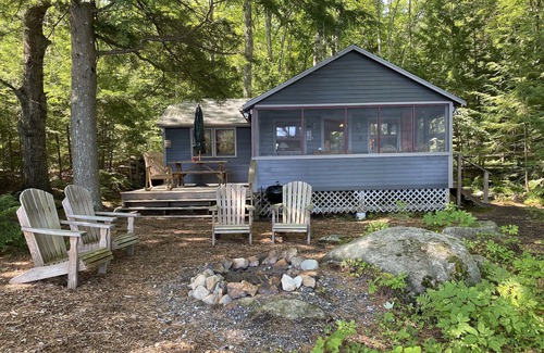 Relax in our charming 2 bedroom 'Maine Camp' lakefront cottage, which sits on 1 and 1/2 heavily wooded and secluded acres and is only 45 feet from 125 feet of private lakefront. The lakefront and has its own private small sandy beach as well as use of adjacent large sandy beach, which is shared with owners.