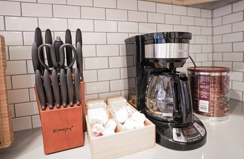 The fully equipped and updated kitchen is a chef's dream, with everything you need to whip up delicious meals, from cookware to utensils, and more. The spacious granite island, with seating for four, is the perfect spot to gather and enjoy meals together, play board games, or catch up on emails. You'll also find a dining set with four seats for more formal meals. The comfortable and inviting living area is the perfect place to unwind after a day of exploring the city. Sink into the plush sofa or oversized lounge chair and indulge in a movie night or catch up on your favorite shows on the 50-inch TV.