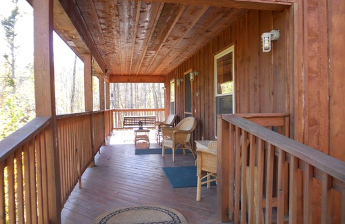 Spend plenty of time relaxing on the front porch with comfortable seating areas and ceiling fans, overlooking the wooded hillside. This secluded cabin does not allow you to see any neighbors. In the summer, enjoy fishing, swimming, boating, hiking, and leisure walks. In winter, enjoy hiking and roasting marshmallows over the campfire. The dock area requires about a 3-4 minute walk downhill from the cabin.