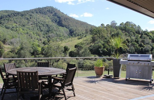 Situated on a 40-acre property that’s also a Santa Gertrudis stud, the beautiful home offers glorious views over the Nowendoc River and surrounding countryside.