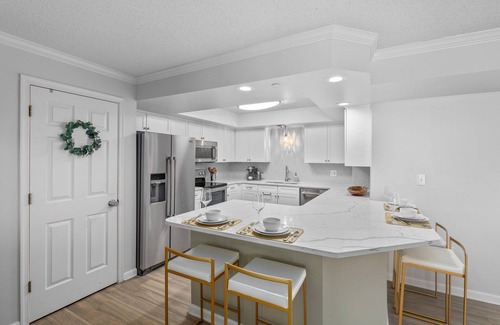 • Kitchen: Completely renovated with stunning quartz counters, cabinet refacing and sleek Maytag stainless appliances are complimentary to the entire open-concept living area. The bar counter with fresh, contemporary stools adds seating and style. Dishes, glasses, silverware, cookware and utensils are high-quality and plentiful. Small appliances include a Cuisinart 12-cup coffee maker, Keurig coffee maker, Kitchen Aid mixer, 4-slice stainless steel Cuisinart toaster, Cuisinart blender/food processor, and a crock pot. Dishwasher detergent pods and liquid dish soap are provided.