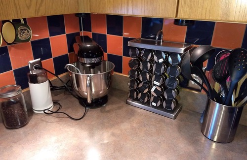 --Gourmet kitchen with new refrigerator and stove, blender, microwave, slow cooker, rice cooker, dutch oven, sharp cutlery, power mixer, airpopper, quality cookware, and lots of wine glasses.