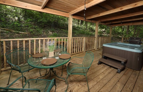 A private hot tub, granite countertops, and brand new appliances create an upscale environment. While the cabin is modern and up to date, the wood-burning fireplace and other finishing touches create a rustic ambiance.