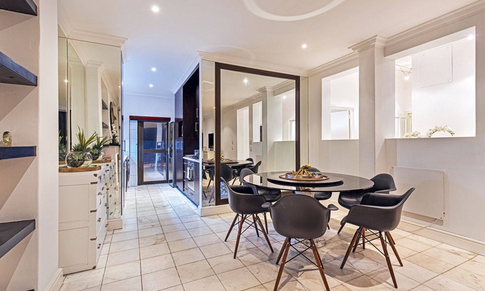A humble yet glamourous and homely 3 bedroomed furnished apartment, that offers a beautifully crafted fully equipped kitchen in dark wood and chrome. Straight from the kitchen is the private courtyard where you can enjoy your first cup of coffee, breakfast or even a BBQ. The air-conditioned apartment has a typical open plan kitchen/ dining/ living area, complete with all the necessary amenities, including but not limited to a Nespresso coffee machine, flat screen TV and sound bar, Marshall speaker, dishwasher, washing machine and tumble dryer.