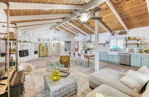 Inside the retro-style kitchen, you'll find all the silverware, pots, pans and plates you need to cook dinner with friends and family! There are small appliances including a Keurig, toaster, kettle, microwave, and blender.