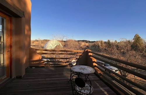 A spacious suite with sunrise, sunset, and milky way views from its private deck, this Pueblo House room offers a king bed, kitchenette, and ensuite bath. The details and craftsmanship of your suite will transport you into serenity, connection with nature, the indigenous heritage, and the eclectic global influences of this special New Mexican location.