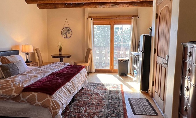 A spacious suite with sunrise, sunset, and milky way vistas from its private deck, this Pueblo House room offers a king-size bed, kitchenette, and ensuite bath. The details and craftsmanship of the space will transport you into serenity and connection with nature, the indigenous heritage, and the eclectic global influences of your New Mexican location.