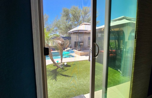 Welcome to our 2400 sq foot modern desert home! Only 30 minutes from the airport and 20 minutes to Glendale, enjoy your relaxing home away from home! Featuring designer keyless entry security gate and front door, open floor plan with lots of natural light, custom lighting throughout, walk in closet in master, dual sinks in both full bathrooms, 1/2 bath, ceiling fans in every room, large kitchen with island & pantry, office, flat screen TV's in all bedrooms and great room, secure indoor/outdoor area with workout equipment and flat screen TV. Spacious back yard features heated pool and hot tub with TV, ping pong table, gazebo with propane fire pit, seating covered by electric retractable awning, multiple sets of outdoor furniture, 2 additional fire pits in back yard, putting green, outdoor built in gas barbecue grill, outdoor bar with TV, and several umbrellas for shade. All 8 TV's are smart TV's for streaming and casting, as well as cable (Cox) included.