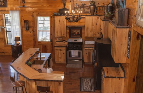 This charming cabin features 2 bedrooms, a loft, and 2 full bathrooms, comfortably sleeping up to 12 guests. Inside, you’ll find a cozy, Texas-inspired space with an open-concept great room combining the kitchen, dining, and living areas under soaring ceilings with antique fans. The spacious kitchen boasts a large island perfect for entertaining, while the dining area includes a table and additional seating at the island’s bar stools.