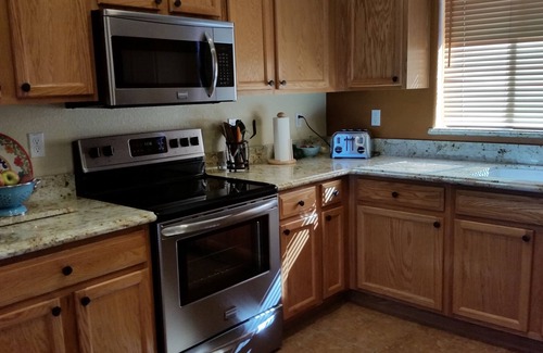 Our 3 bedroom, 2 bath home is fully equipped for your enjoyable stay. The large master bedroom has an on-suite bathroom with double sinks, large walk-in shower and king size bed. The walk-in closet has hangers and room for suitcases for unpacking for your stay. A beautiful oversize master bedroom dresser for your folded clothes if needed.