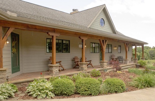 This tranquil retreat is tastefully furnished and beautifully landscaped and is nestled in a scenic woodland farm setting. The home offers more than just your basic cabin, offering 4400 square feet of luxurious comfort, this gorgeous timber frame home will not disappoint! Enjoy the view from the lower level walkout stone patio, the attached outdoor pavilion, the master bedroom balcony, or the front porch with family or friends.