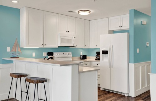 Inside, Saltwater Retreat welcomes you with a bright and airy living room designed for gathering. A comfortable sofa, which doubles as a sleeper, provides seating for relaxing with a good book or watching a movie on the flatscreen TV. The space feels open and cheerful thanks to light furnishings accented with calming shades of blue. Ocean-inspired touches throughout the condo bring in the feel of the island in a way that feels fresh and inviting.